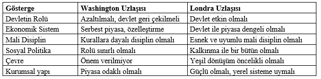 Tablodan görüleceği üzere iki uzlaşı arasındaki en belirgin fark Washington Uzlaşısının klasik – neoklasik – parasalcı ekonomi çizgisini temsil etmesine karşılık Londra Uzlaşısının Keynesyen karma ekonomi görüşüne yakın olmasında ortaya çıkıyor. Londra Uzlaşısı, bir anlamda Washington Uzlaşısı ile Beijing Uzlaşısının uzlaştırılmış bir modelini sunuyor. Kuşkusuz Londra Uzlaşısının Washington Uzlaşısının yerini alması ABD’nin ve onun büyük ölçüde güdümünde bulunan IMF, Dünya Bankası gibi kurumların bu modeli benimsemesine bağlı bulunuyor. Aksi takdirde Londra Uzlaşısı iyi niyetli akademik öneriler çerçevesi olmaktan öteye gidemez.