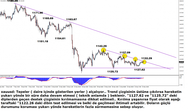 Trend çizgisinin üstüne çıkılırsa hareketin yukarı yönde bir süre daha devam etmesi ( teknik anlamda ) beklenir.”1127.62 ve “1125.72” deki diplerden geçen destek çizgisinin kırılmamasına dikkat edilmeli.. Kırılma yaşanırsa fiyat olarak aşağı taraftaki “1122.26 daki dibin test edilmesi ve belki de geçilmesi ihtimali artabilir. Doların güçlü durumunu koruması yukarı yönde hareketlerin fazla sürmemesine sebep oluyor.