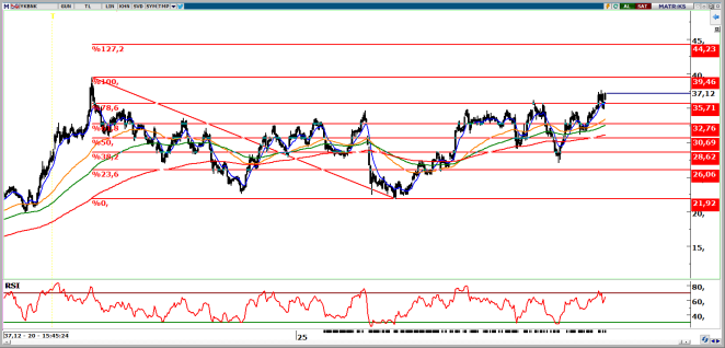 Hissede yakından izlediğimiz fibo %78.6 seviyesinin geçtiği 35.70 direncinin aşılması ve üzerinde kalıcılığın sağlanması sonrası olumlu bir teknik görünümün bulunduğunu söyleyebiliriz. Dolayısıyla 35.70 altındaki kapanışlarda zarar kes uygulanmak şartı ile kısa vadede yön yukarı okunabilir.