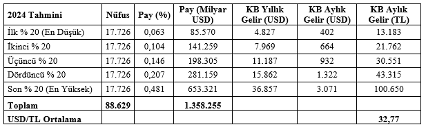 Elimizdeki son gelir dağılımı verisi 2023 yılına ait olduğu için aşağıdaki 2024 tablosu; TÜİK, gelir dağılımı istatistikleri ve nüfus verileri kullanılarak ve 2023 grup payları 2024 yılında da aynı kalmış varsayılarak tarafımızdan hazırlanmıştır (yuvarlamalar nedeniyle toplamlarda farklar çıkabilir):