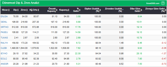Hisselerin en düşük fiyatlarını, en yüksek fiyatlarını, ağırlıklı ortalama ve kapanış fiyatlarını, dipten ve zirveden uzaklıklarını görebilirsiniz. Hisselerin dip ve zirve seviyelerini takip ederek fiyatlarının dip ve zirve seviyelerine göre ne kadar iskontolu yada primli olduğunu görebilirsiniz.