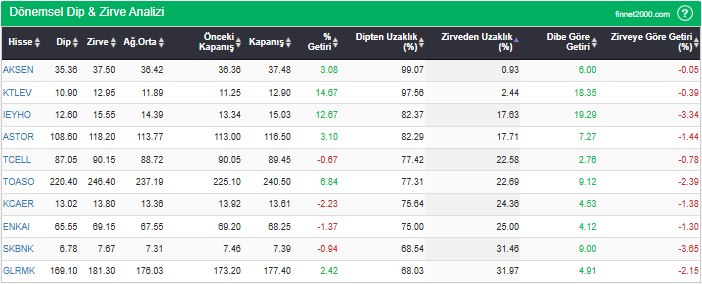 Hisselerin en düşük fiyatlarını, en yüksek fiyatlarını, ağırlıklı ortalama ve kapanış fiyatlarını, dipten ve zirveden uzaklıklarını görebilirsiniz. Hisselerin dip ve zirve seviyelerini takip ederek fiyatlarının dip ve zirve seviyelerine göre ne kadar iskontolu yada primli olduğunu görebilirsiniz.