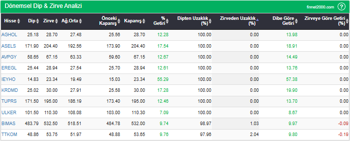 Hisselerin en düşük fiyatlarını, en yüksek fiyatlarını, ağırlıklı ortalama ve kapanış fiyatlarını, dipten ve zirveden uzaklıklarını görebilirsiniz. Hisselerin dip ve zirve seviyelerini takip ederek fiyatlarının dip ve zirve seviyelerine göre ne kadar iskontolu yada primli olduğunu görebilirsiniz.