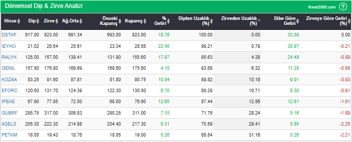 Hisselerin en düşük fiyatlarını, en yüksek fiyatlarını, ağırlıklı ortalama ve kapanış fiyatlarını, dipten ve zirveden uzaklıklarını görebilirsiniz. Hisselerin dip ve zirve seviyelerini takip ederek fiyatlarının dip ve zirve seviyelerine göre ne kadar iskontolu yada primli olduğunu görebilirsiniz.