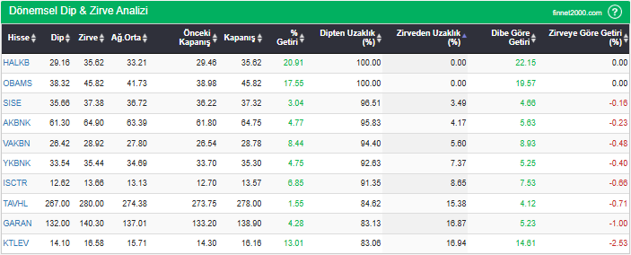 Hisselerin en düşük fiyatlarını, en yüksek fiyatlarını, ağırlıklı ortalama ve kapanış fiyatlarını, dipten ve zirveden uzaklıklarını görebilirsiniz. Hisselerin dip ve zirve seviyelerini takip ederek fiyatlarının dip ve zirve seviyelerine göre ne kadar iskontolu yada primli olduğunu görebilirsiniz.
