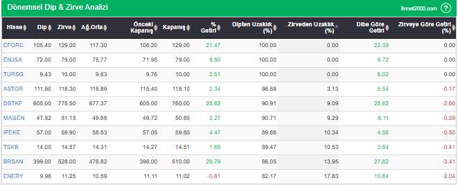 Hisselerin en düşük fiyatlarını, en yüksek fiyatlarını, ağırlıklı ortalama ve kapanış fiyatlarını, dipten ve zirveden uzaklıklarını görebilirsiniz. Hisselerin dip ve zirve seviyelerini takip ederek fiyatlarının dip ve zirve seviyelerine göre ne kadar iskontolu yada primli olduğunu görebilirsiniz.