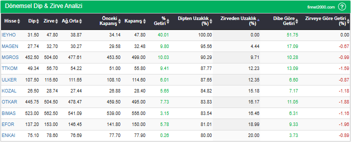 Hisselerin en düşük fiyatlarını, en yüksek fiyatlarını, ağırlıklı ortalama ve kapanış fiyatlarını, dipten ve zirveden uzaklıklarını görebilirsiniz. Hisselerin dip ve zirve seviyelerini takip ederek fiyatlarının dip ve zirve seviyelerine göre ne kadar iskontolu yada primli olduğunu görebilirsiniz.
