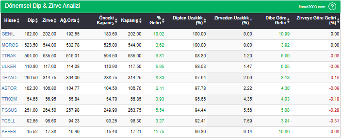 Hisselerin en düşük fiyatlarını, en yüksek fiyatlarını, ağırlıklı ortalama ve kapanış fiyatlarını, dipten ve zirveden uzaklıklarını görebilirsiniz. Hisselerin dip ve zirve seviyelerini takip ederek fiyatlarının dip ve zirve seviyelerine göre ne kadar iskontolu yada primli olduğunu görebilirsiniz.